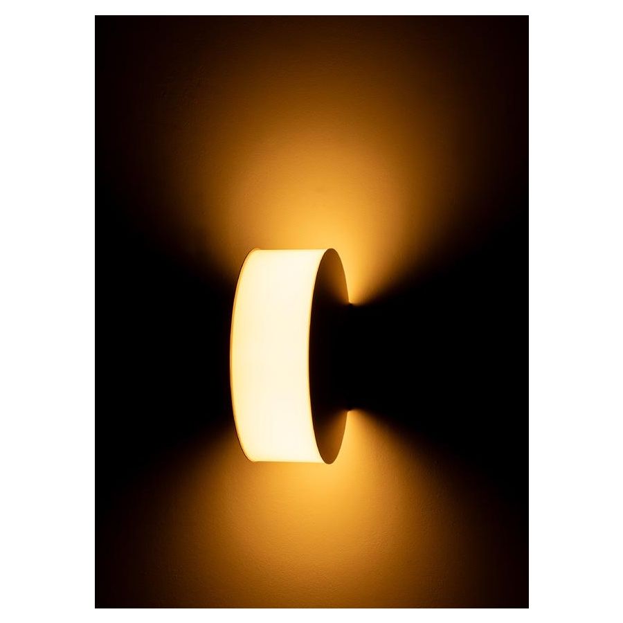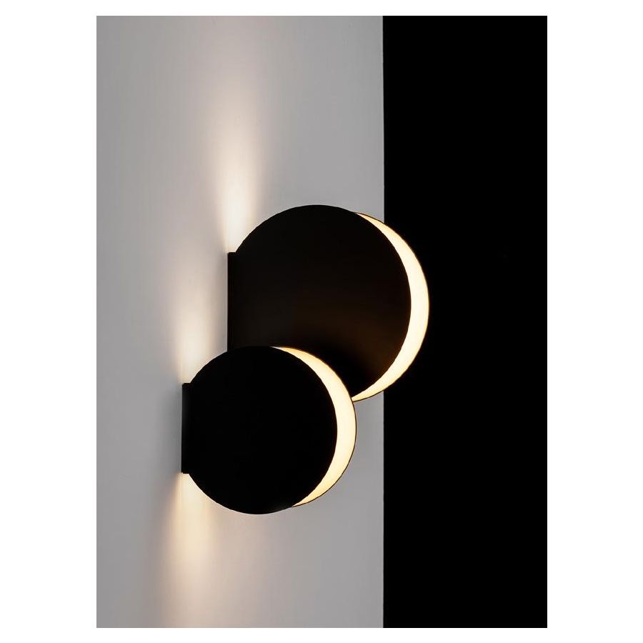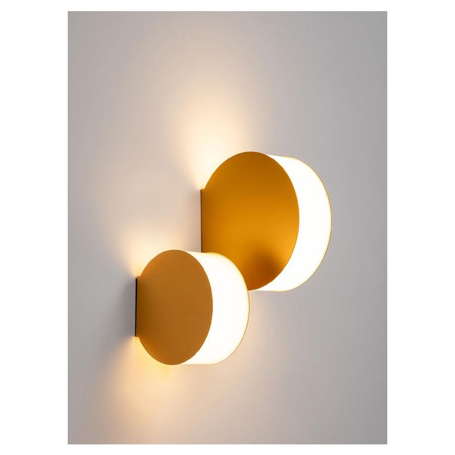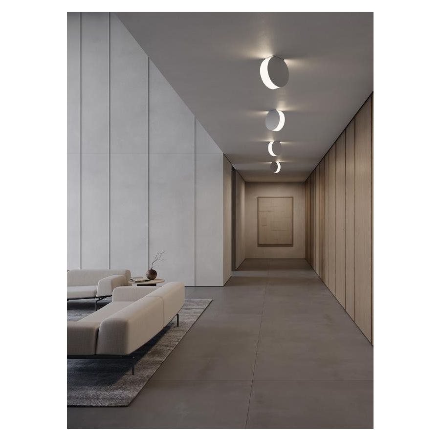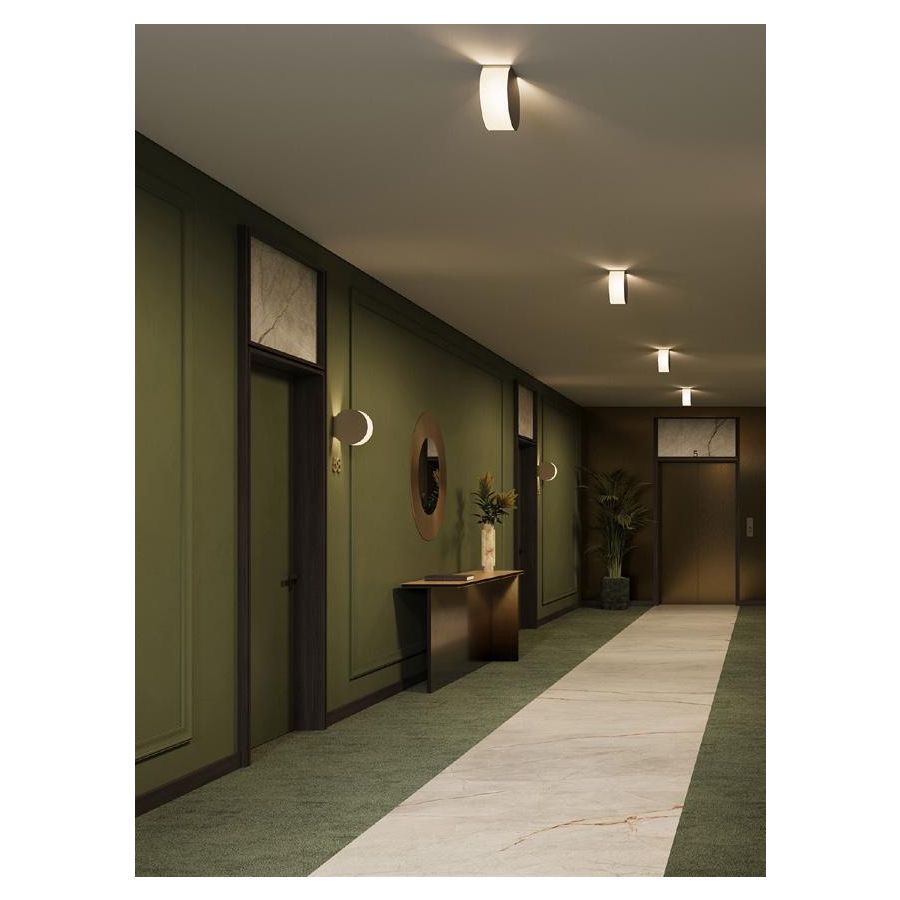 Emerging between two sleek metal circles, CHIP is a versatile wall and ceiling light that radiates pure geometric simplicity. The smaller version is perfect for corridors, hallways or staircases in linear setups and is leading the way with its signal quality. The larger version takes center stage as a statement piece. Whether arranged in playful compositions or positioned with precision, CHIP adapts effortlessly—horizontal, vertical, and everything in between. CHIP comes in different finishes: powdercoated (black or white) and anodized (gold or olive).