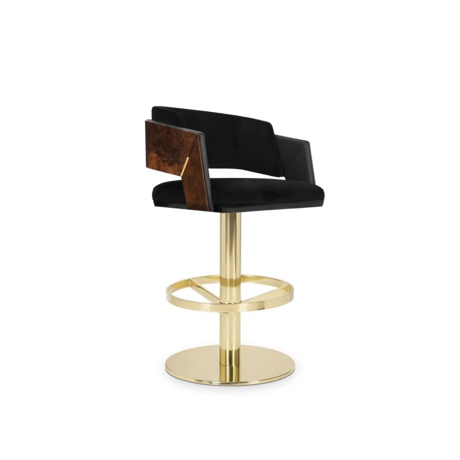 Fusing modern and ancient influences, the Galea Swivel Bar Chair embodies elegance and sophistication. Inspired by Roman warrior helmets, this bar chair features a body crafted from wood and brass, upholstered in luxurious velvet and leather. The addition of a swivel feature enhances both comfort and style, making it a perfect choice for upscale bars and lounges.