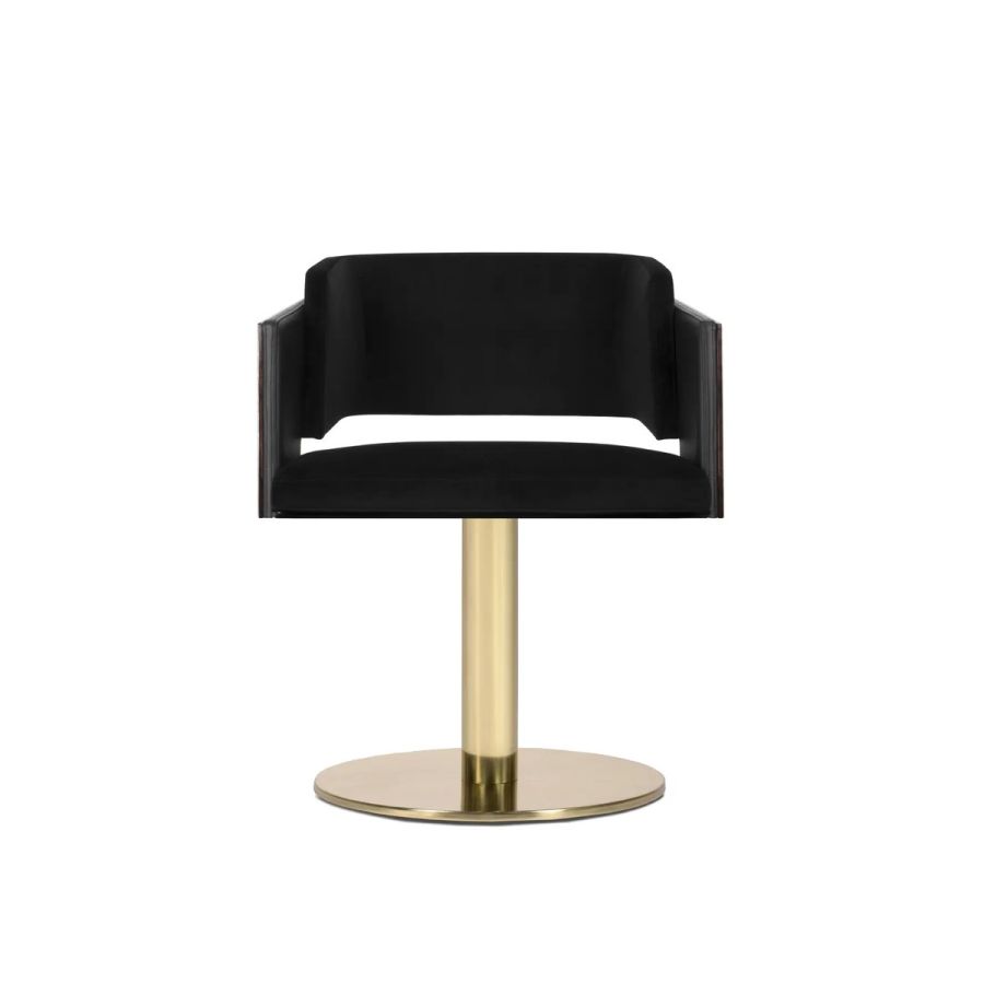 Galea is a glamorous dining chair that seamlessly combines ancient inspiration with modern design. Drawing from a helmet worn by warriors in the Roman Empire, this velvet and leather chair exudes elegance and sophistication. With its swivel feature, it offers elevated comfort and style, making it an ideal choice for upscale restaurants and contemporary dining rooms.