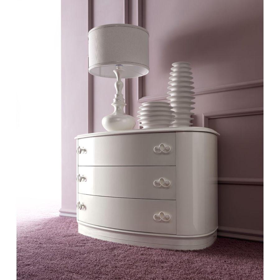 Classic dresser of 3 drawers and a classic bedside table with curved sides. Simplicity matched with style for this wooden item, adding sophistication and good taste to your bedroom. Versatile, refined , thanks to a wide range of brushed, laquered finishings or silver,gold leaf decorations Giusy is suitable for classic style bedroom, but, chosing the right colours it is also perfect for more modern settings.