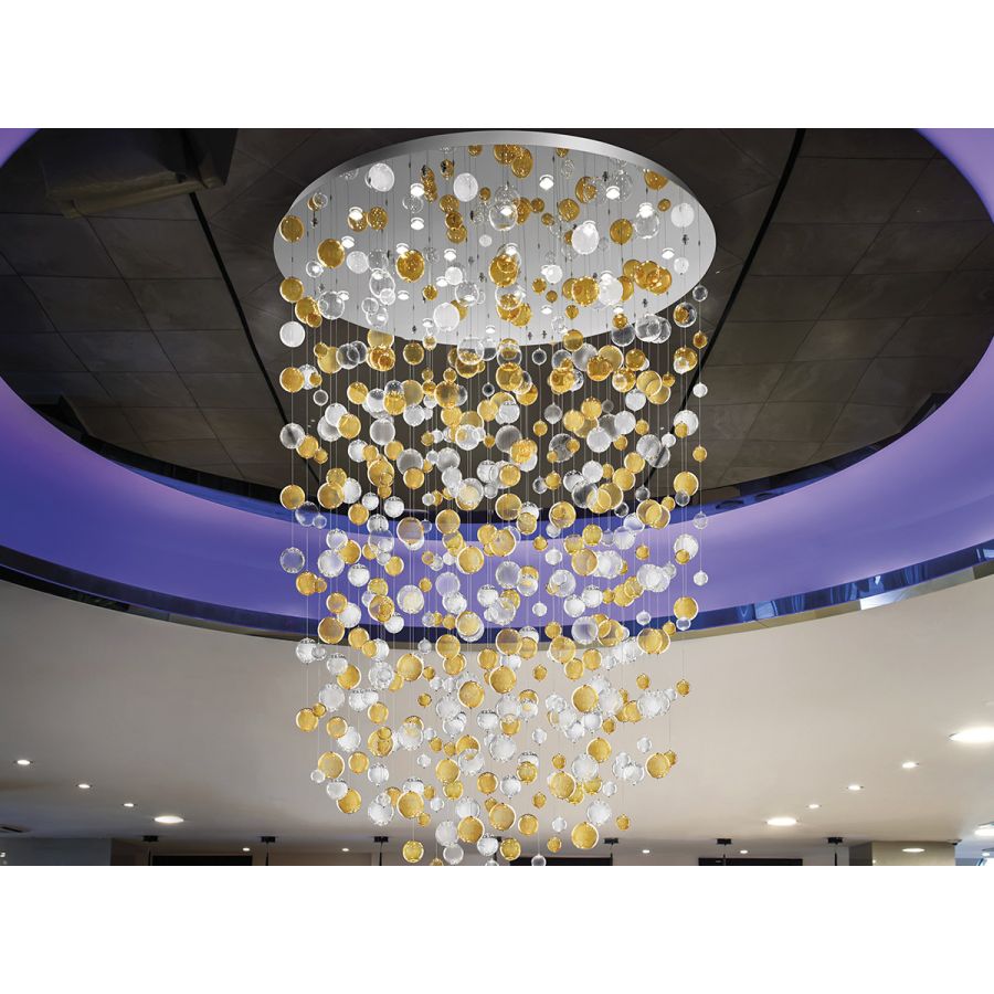 Blown glass spheres that float in the air. The dynamic effect is amplified by the direct light hitting the glass, creating shades of light, multi-formed and iridescent.