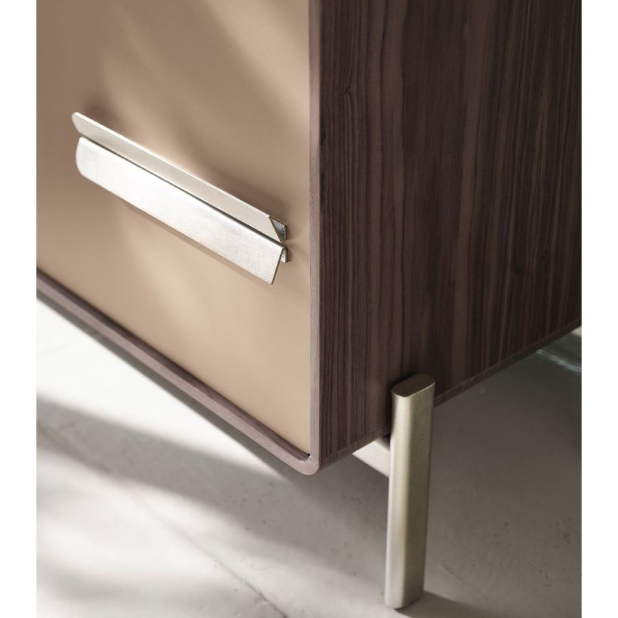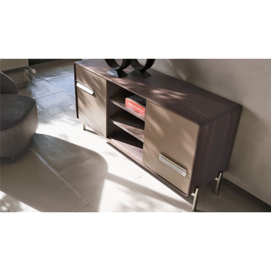 Wooden sideboard with 2 doors and open compartment in canaletto from the simple and contemporary line. The rounded shapes of the structure are highlighted by the linearity of the metal handles that form asymmetrical games. The metal base with elliptical section in chromatic combination with the handles, elegantly supports the structure giving it a light and informal look.