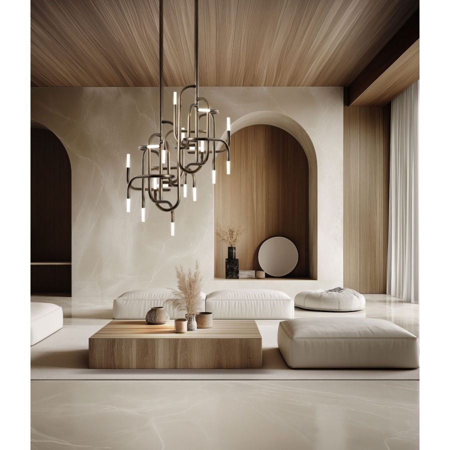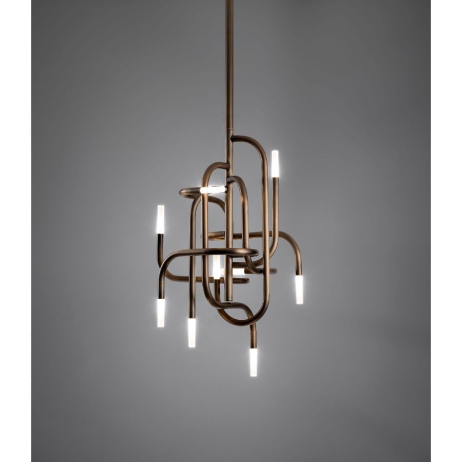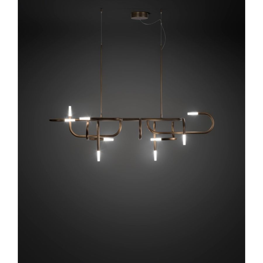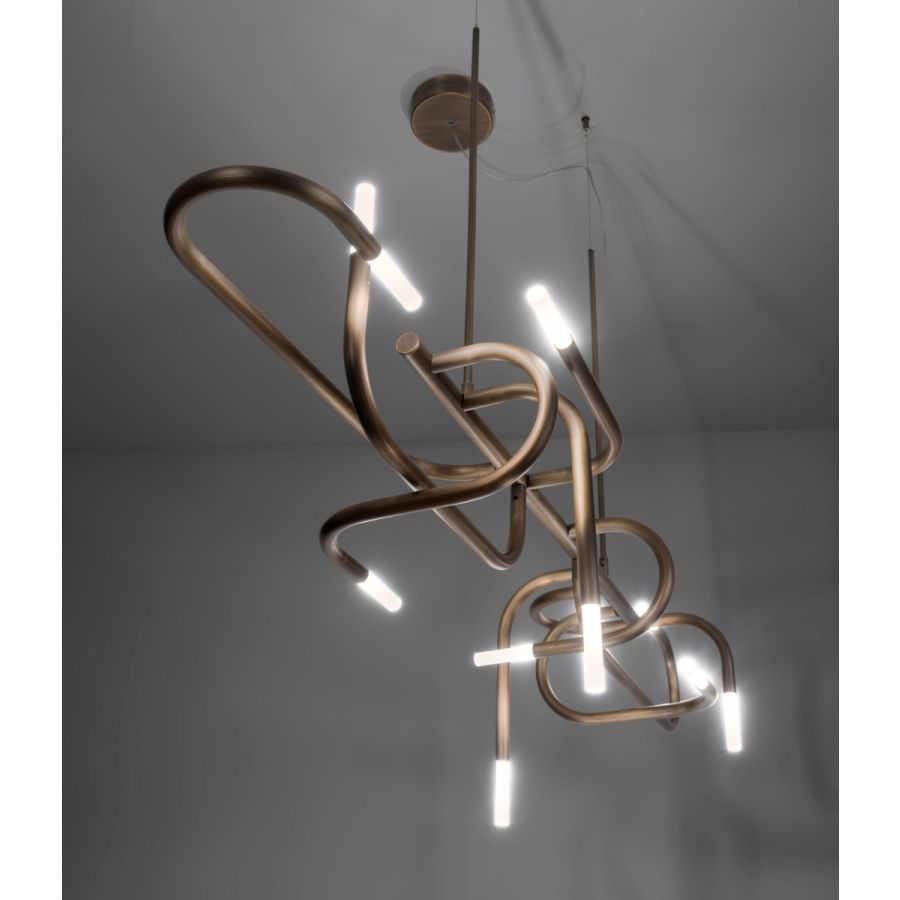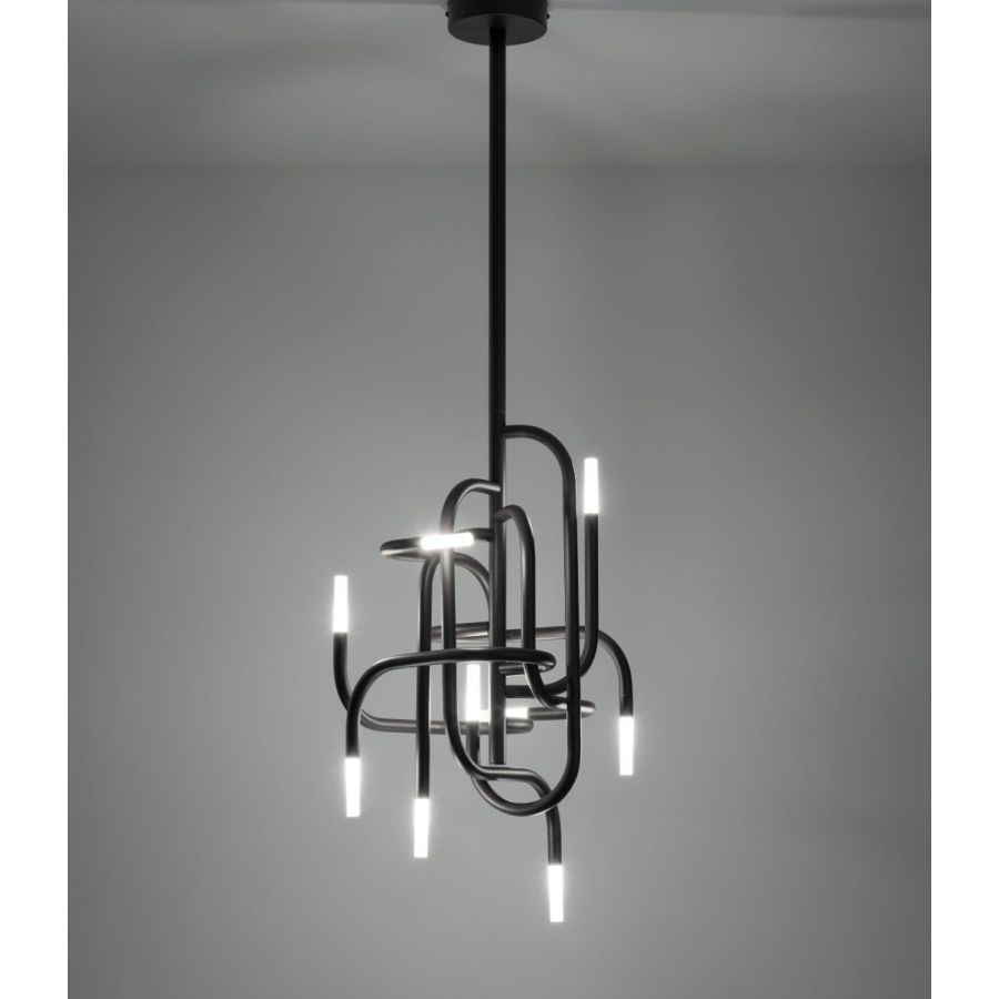 Just as mangrove plants are known for their twisted roots, Mangrove derives its strong decorative identity from the non-random intertwining of the tubes that compose it. Constantly varying directions, softened by identical connectors, combine with luminous terminals, reinterpreting nature through a technical lens and generating continuously new and intriguing variations of light and reflections.
