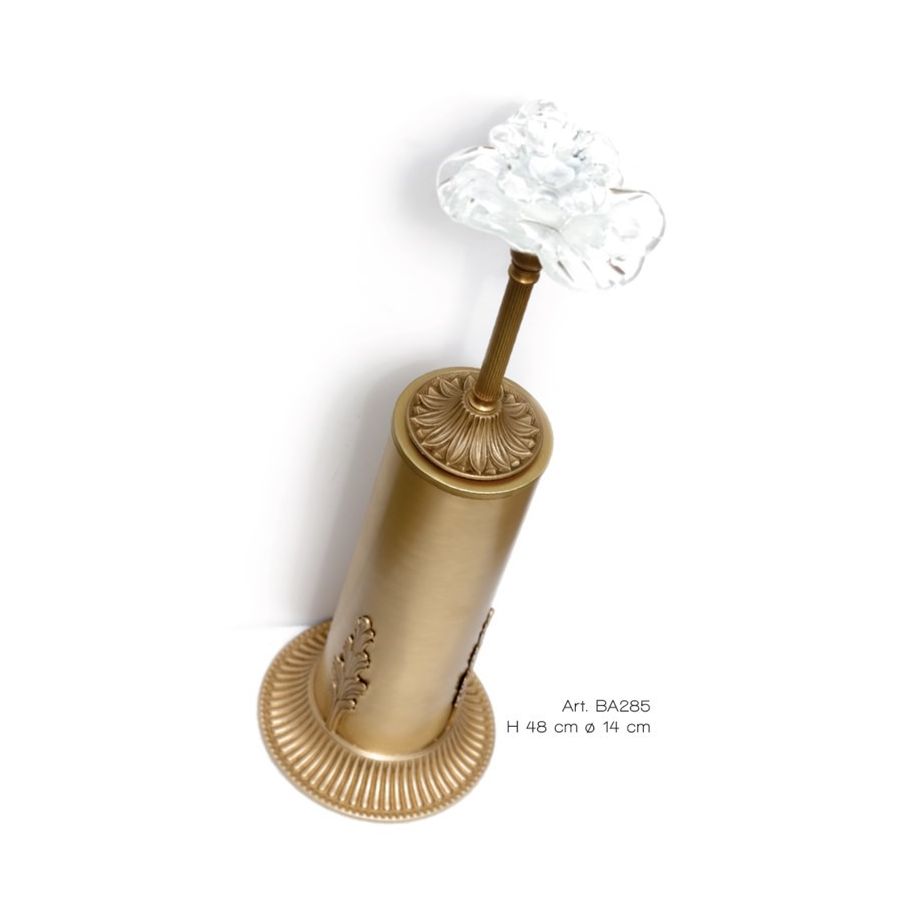 Toilet brush in brass (finishing OV) with FLOWER in transparent and white Murano glass. Functional elements that create an extremely elegant, welcoming and high-value bathroom.
