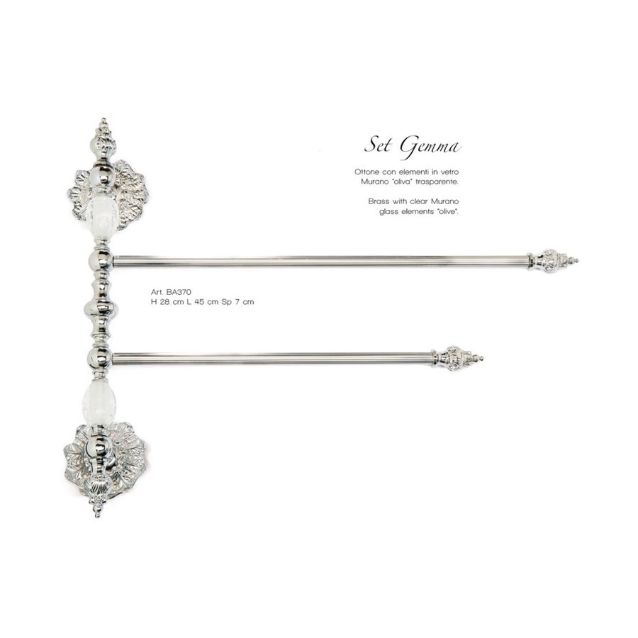 Double Towel holder in brass with oliva in transparent Murano glass. Functional elements that create an extremely elegant, welcoming and high-value bathroom.