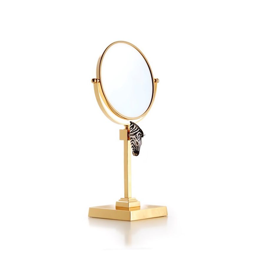 Table mirror brass with magnifying (2x) in gold 24k with micro casting of enameled brass zebra. Functional elements that create an extremely elegant, welcoming and high-value bathroom.