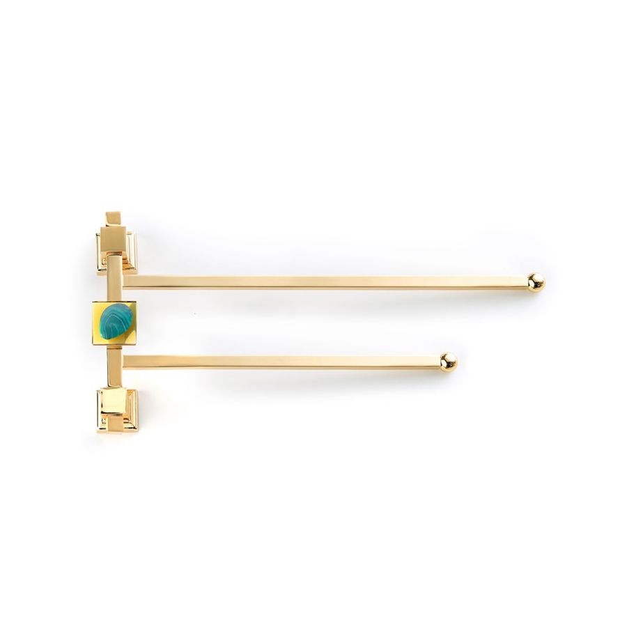 Double towel holder in gold 24K with amber glass and green Agate medallion. Functional elements that create an extremely elegant, welcoming and high-value bathroom.
