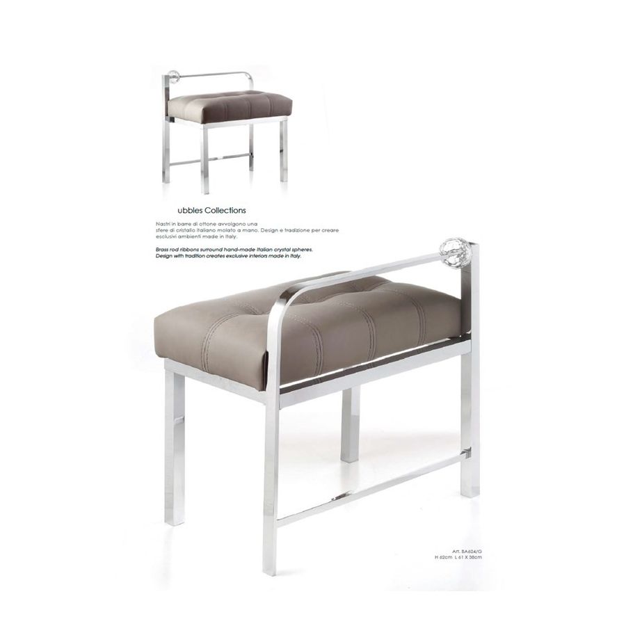 Chrome brass stool/pouff with hand-cutted polished clear crystal, sat in washable fireproof ecopelle. Functional elements that create an extremely elegant, welcoming and high-value bathroom.