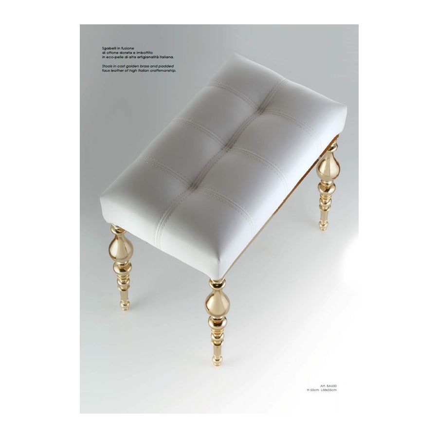 Stool/pouff for bathroom in cast golden brass and padded faux leather. Functional elements that create an extremely elegant, welcoming and high-value bathroom.