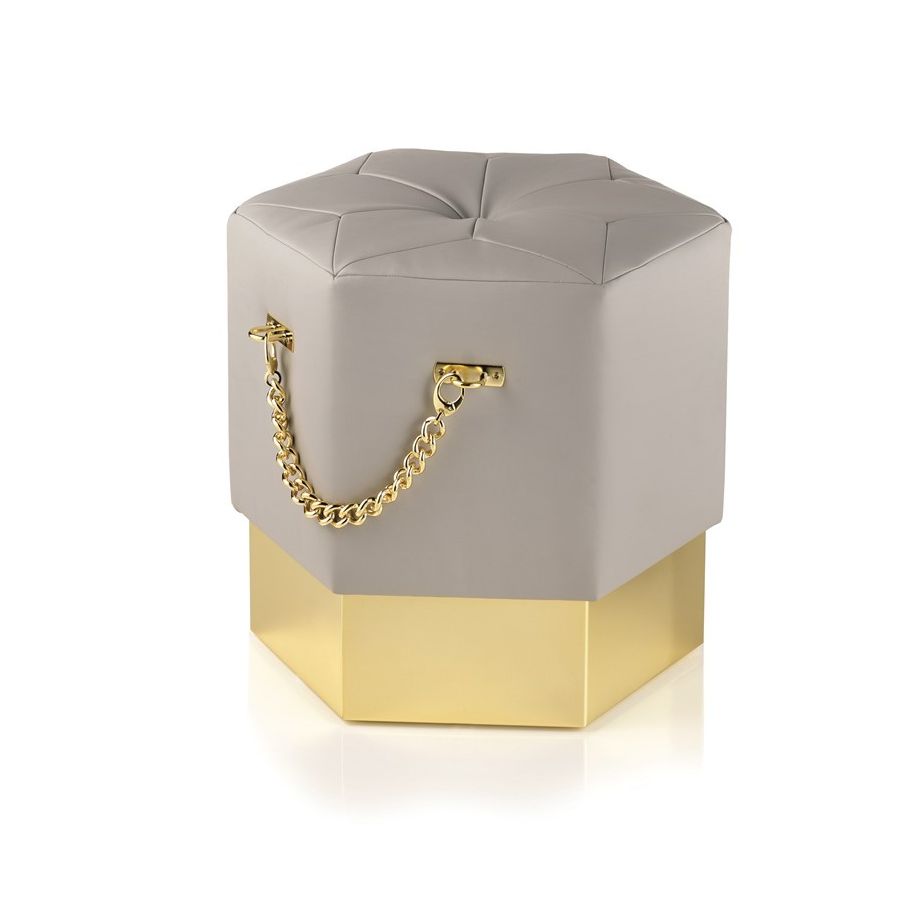 Pouff in eco pelle gray color with chain. Brass metal polished brass color.