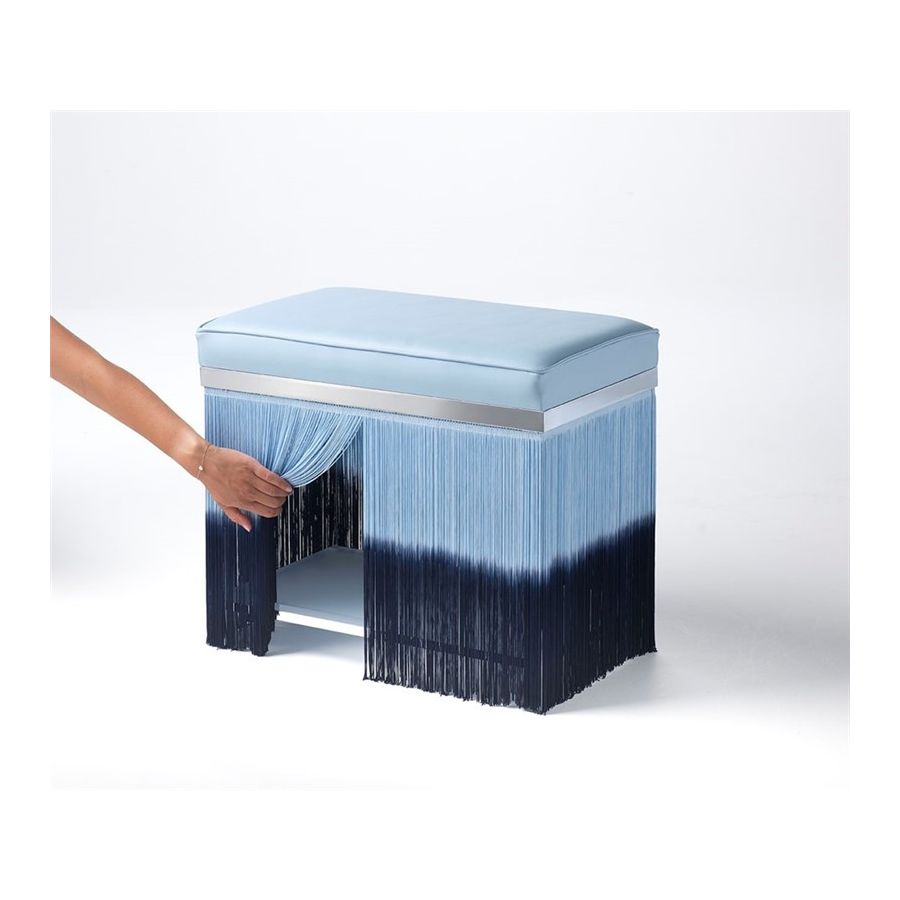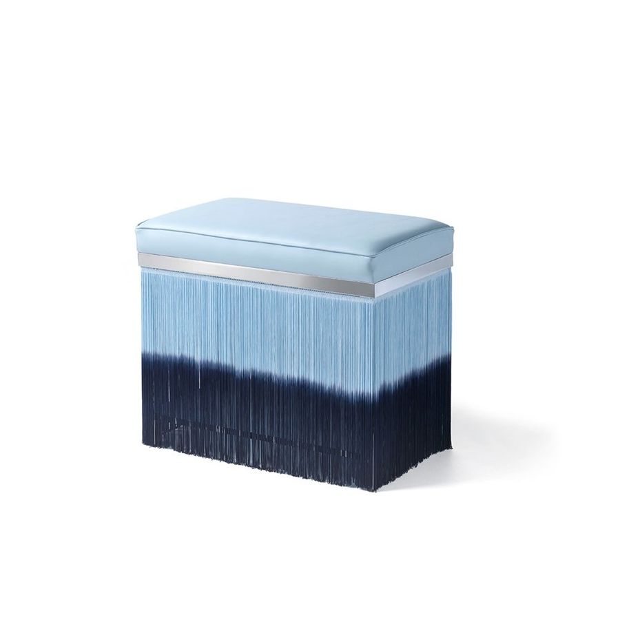 Pouff in clear-blue eco pelle with trimming in shaded tripolino fringe coloureb by hand. Cromed Brass metal and internal shelf in satin plexiglass.