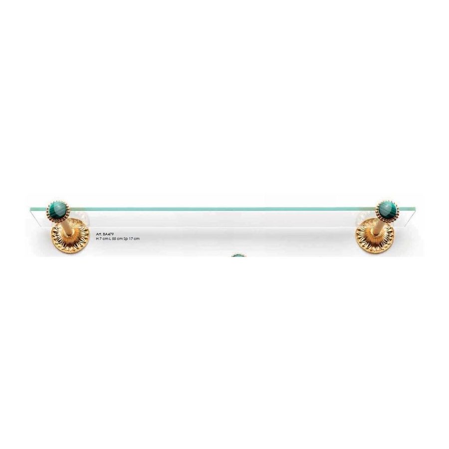 Glass shelf in dotted diamond brass and malachite cabochon. Functional elements that create an extremely elegant, welcoming and high-value bathroom.