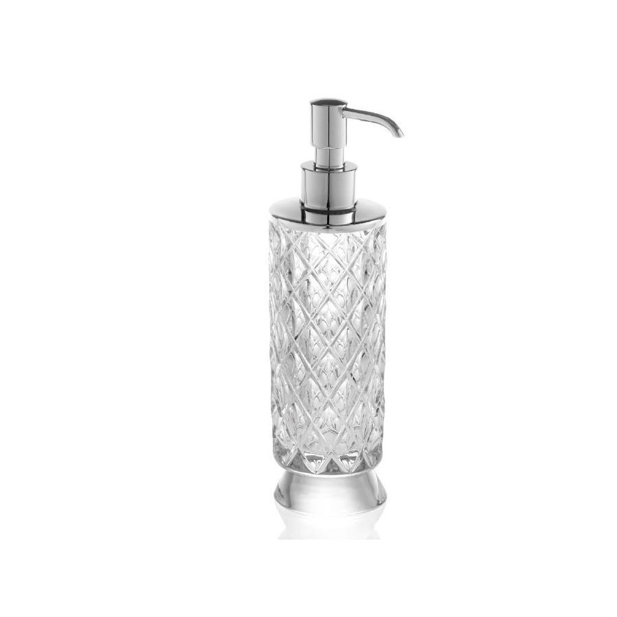 Italian hand-cut crystal set with three-dimensional rhombus pattern. Soap Dispenser. Functional elements that create an extremely elegant, welcoming and high-value bathroom.
