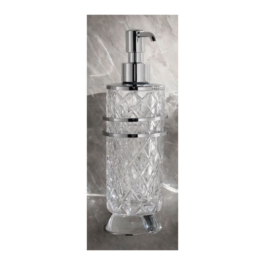 Italian hand-cut crystal set with three-dimensional rhombus pattern. Wall Soap Dispenser. Functional elements that create an extremely elegant, welcoming and high-value bathroom.