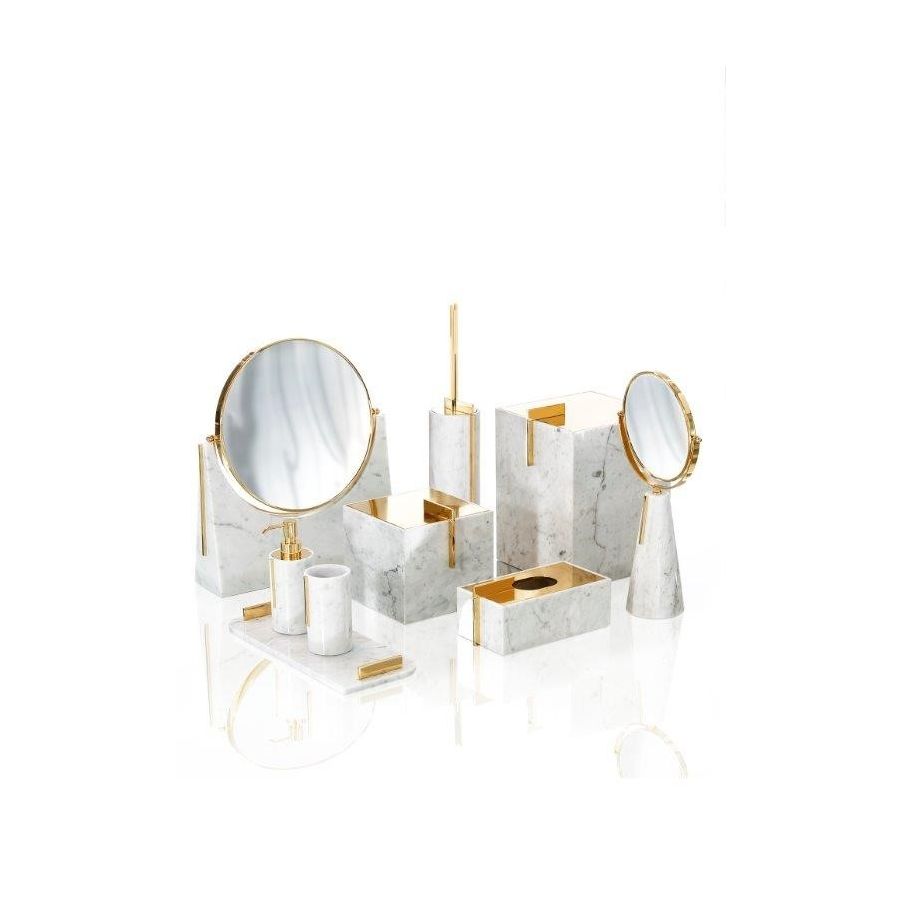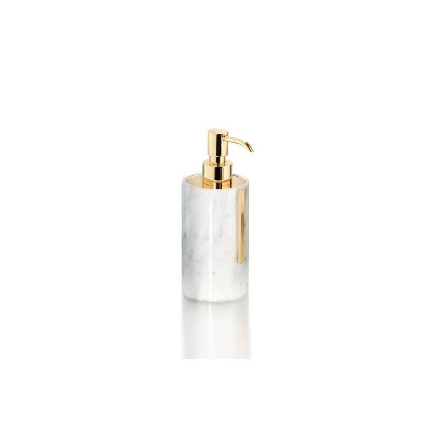 Soap Dispenser in Carra Marble decorated with gold brass element. Functional elements that create an extremely elegant, welcoming and high-value bathroom.
