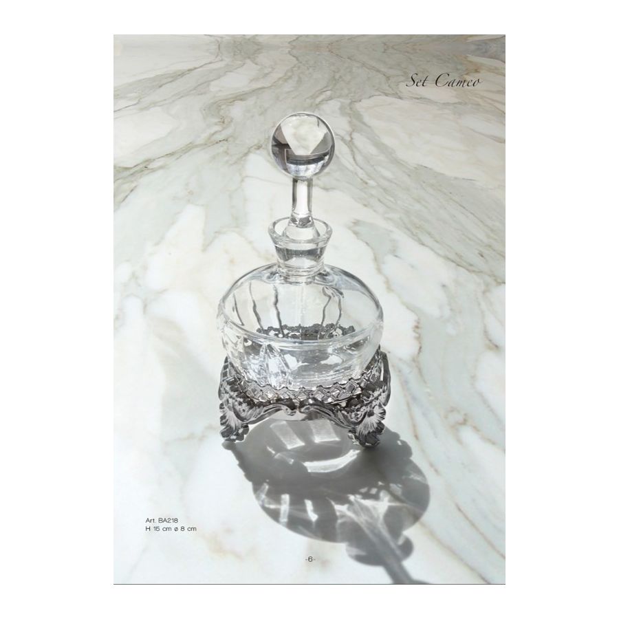 Perfume bottle in clear Italian crystal with hand-carved lady portrait cameo and chrome brass element base. Functional elements that create an extremely elegant, welcoming and high-value bathroom.