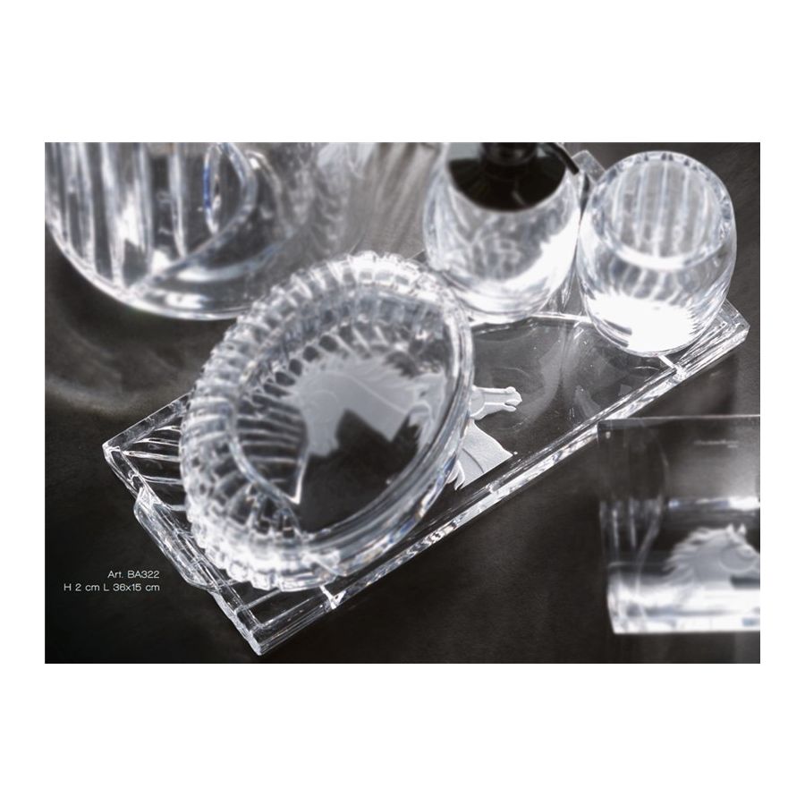 Tray in italian hand-cutted crystal with engraved horse image. Functional elements that create an extremely elegant, welcoming and high-value bathroom.