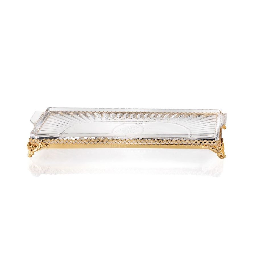 Rose set Tray in Italian hand-cut crystal of Pb24% with an engraving of matt rose. The base is made with classic brass decorations, gold 24k finishing. Functional elements that create an extremely elegant, welcoming and high-value bathroom.