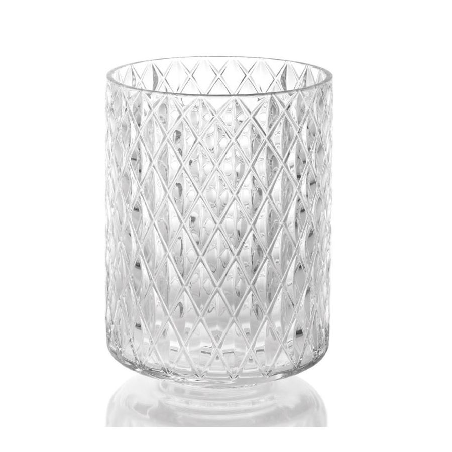 Italian hand-cut crystal set with three-dimensional rhombus pattern. Waste basket. Functional elements that create an extremely elegant, welcoming and high-value bathroom.