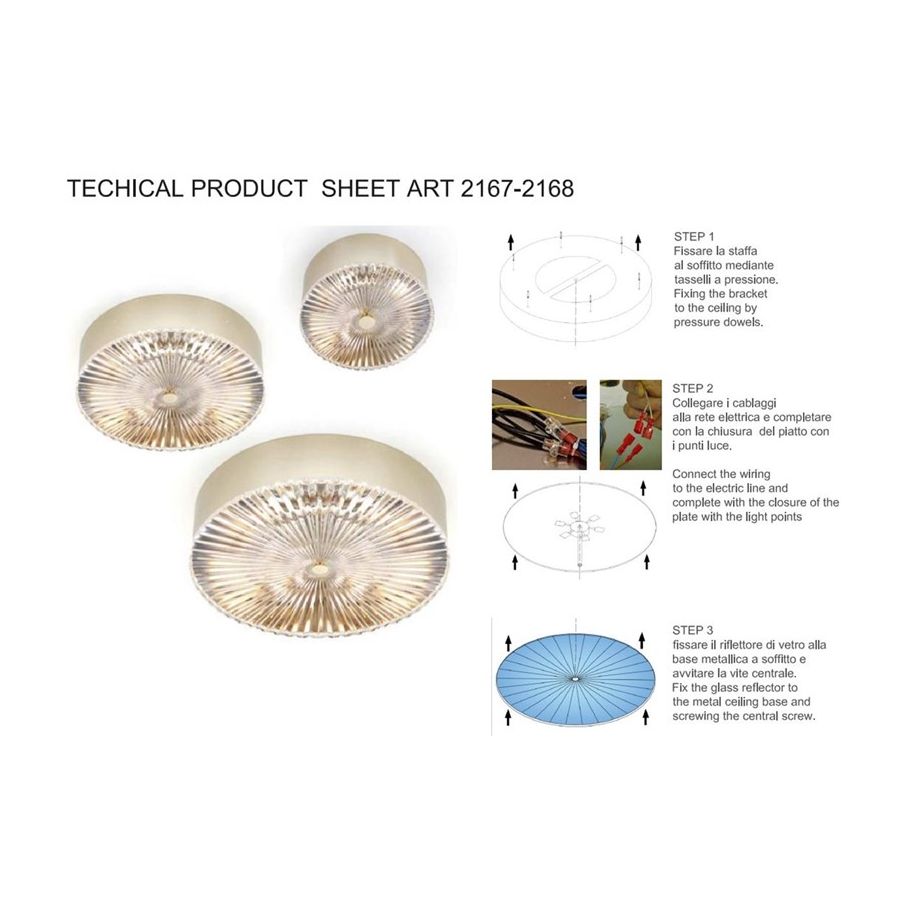 Ceiling lamp with hand-cut italian crystal disk. Lighting item that diffuses the light with great effect in the surrounding environement creating a warm and welcoming atmosphere.