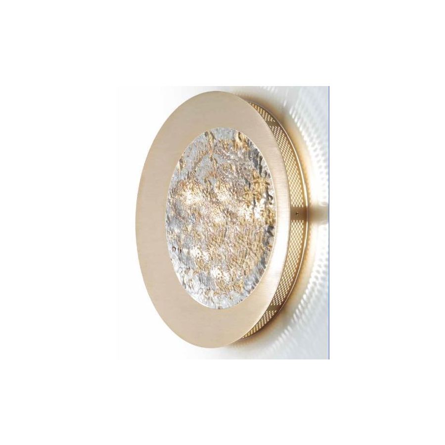 Ceiling lamp/wall sconce with hammered glass and decorations in gold leaf. Lighting item that diffuses the light with great effect in the surrounding environement creating a warm and welcoming atmosphere.