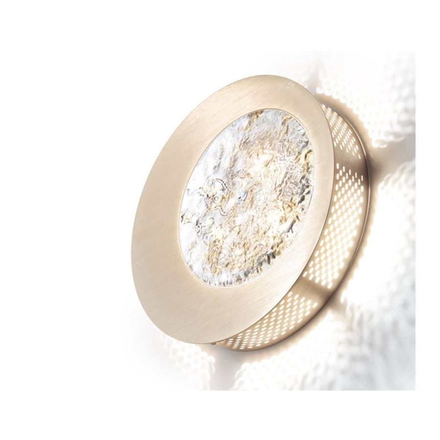 Ceiling lamp/wall sconce with hammered glass decorated in gold leaf. Lighting item that diffuses the light with great effect in the surrounding environement creating a warm and welcoming atmosphere.