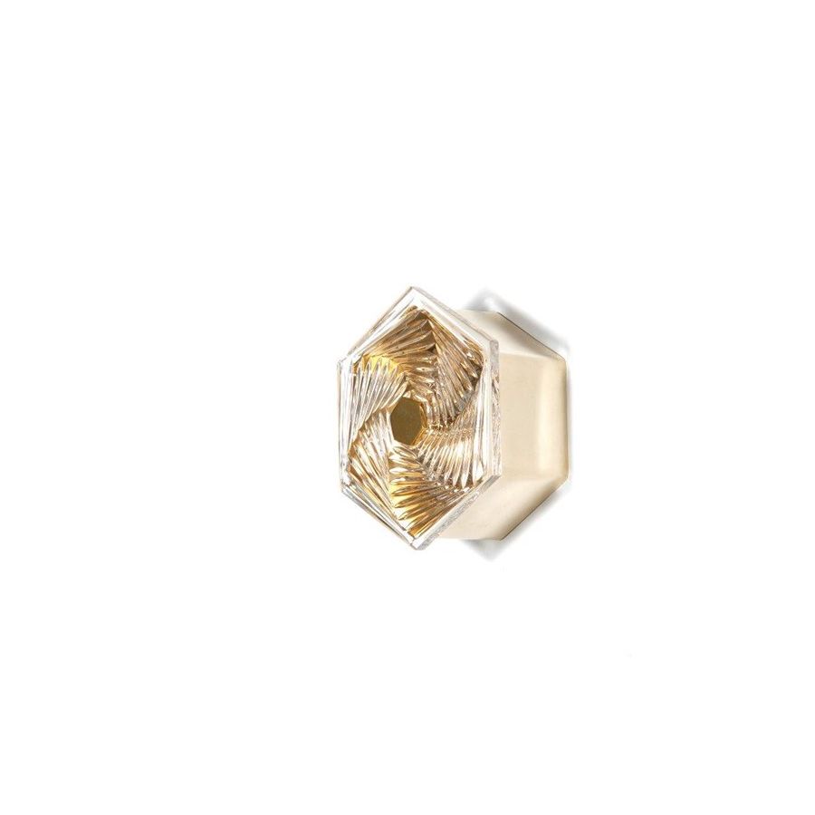 Hexagonal plafon/Applique with crystal cut by hand. Lighting item that diffuses the light with great effect in the surrounding environement creating a warm and welcoming atmosphere.