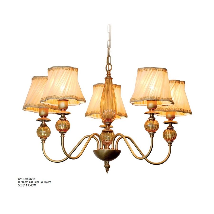 Chandelier with 5 lights, elements in amber Murano glass and double fabric lampshades. Lighting element that diffuses light effectively into the surrounding area, creating a warm and inviting atmosphere.