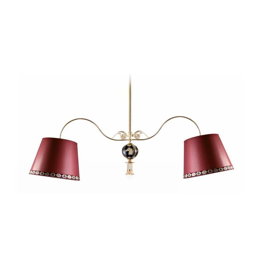 Chandelier with 2+1 light complete with lampshades. Lighting item that diffuses the light with great effect in the surrounding environement creating a warm and welcoming atmosphere.