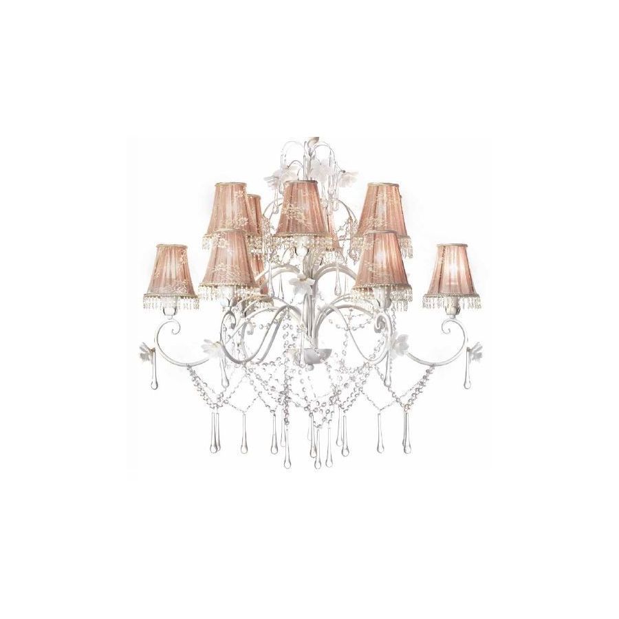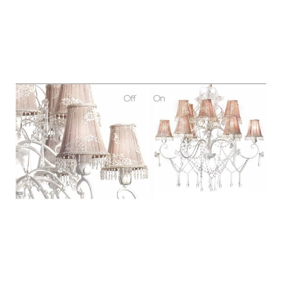 PEARL Collection: 12 lights chandelier in white metal is decorated with crystal pendants and Murano glass roses and drops. Lampshades in lace and pongè fabric add a romantic touch to this elegant chandelier. Lighting item that diffuses the light with great effect in the surrounding environement creating a warm and welcoming atmosphere.