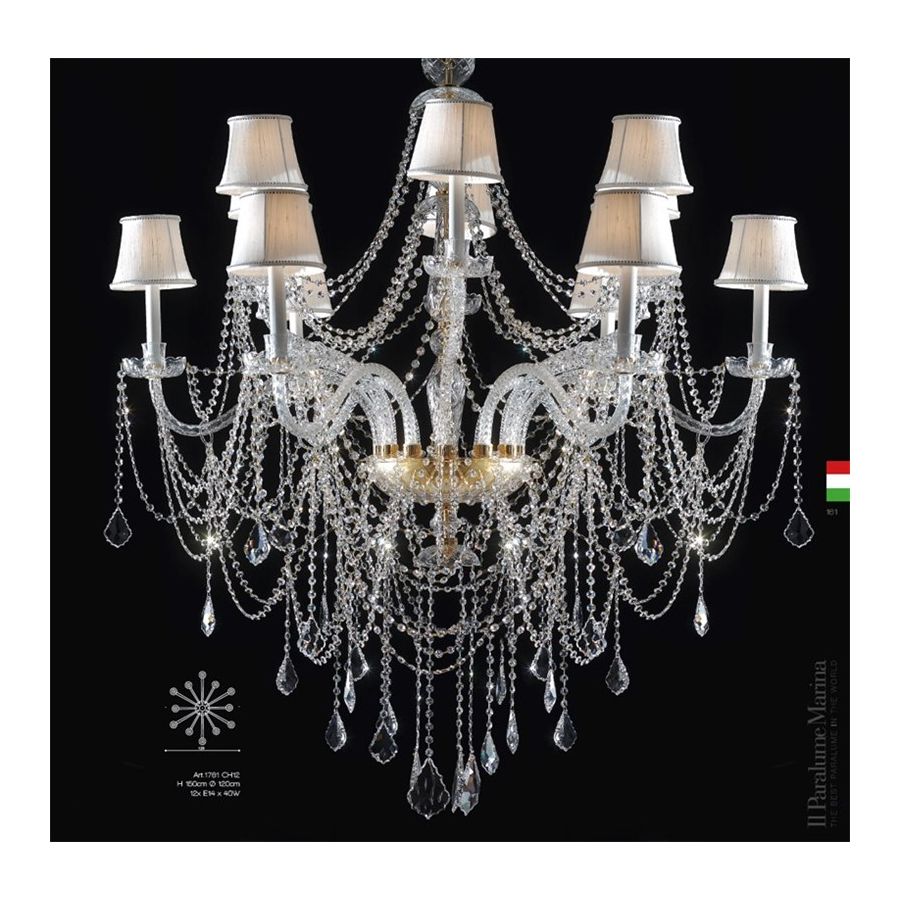 Chandelier 12 lights in clear glass with decorations in crystal and Asfour crystal pendants. Double fabric lampshades. Lighting item that diffuses the light with great effect in the surrounding environement creating a warm and welcoming atmosphere.