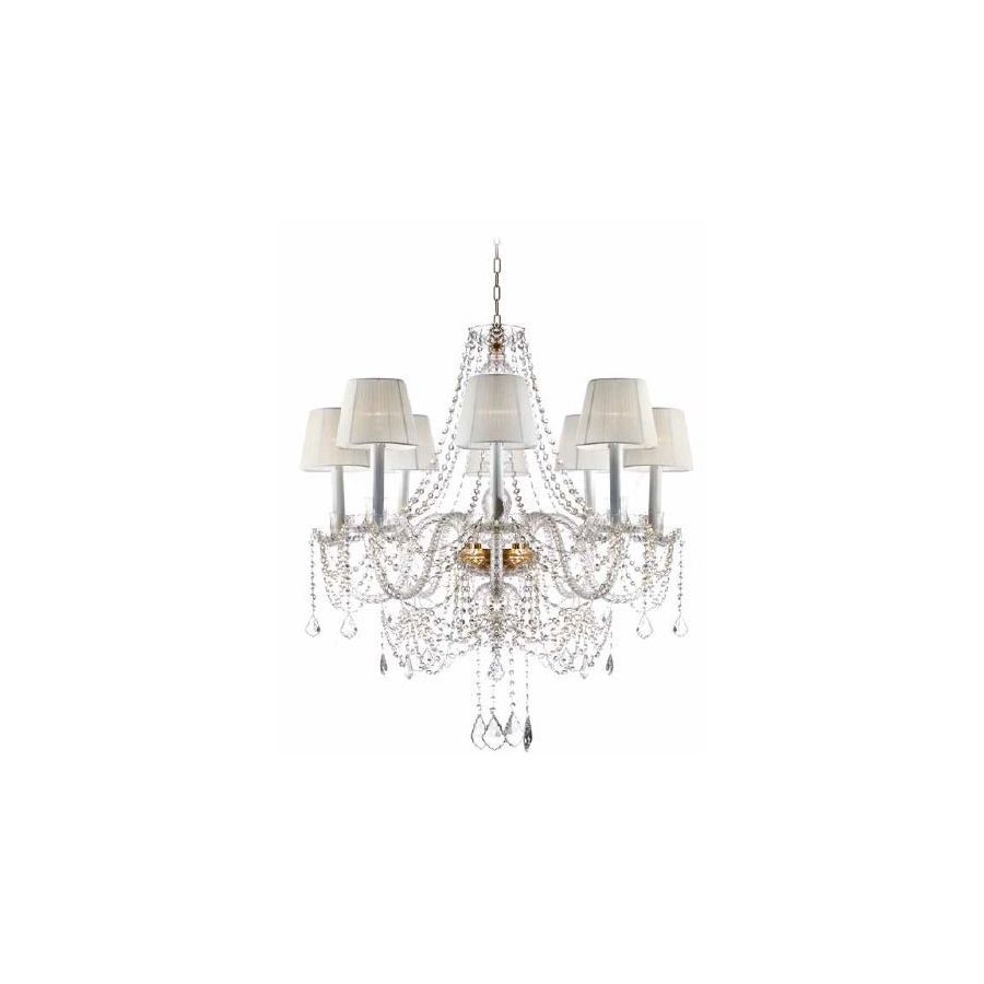 Chandelier 8 lights in clear glass with decorations in crystal and Asfour crystal pendants. Double fabric lampshades. Lighting item that diffuses the light with great effect in the surrounding environement creating a warm and welcoming atmosphere.
