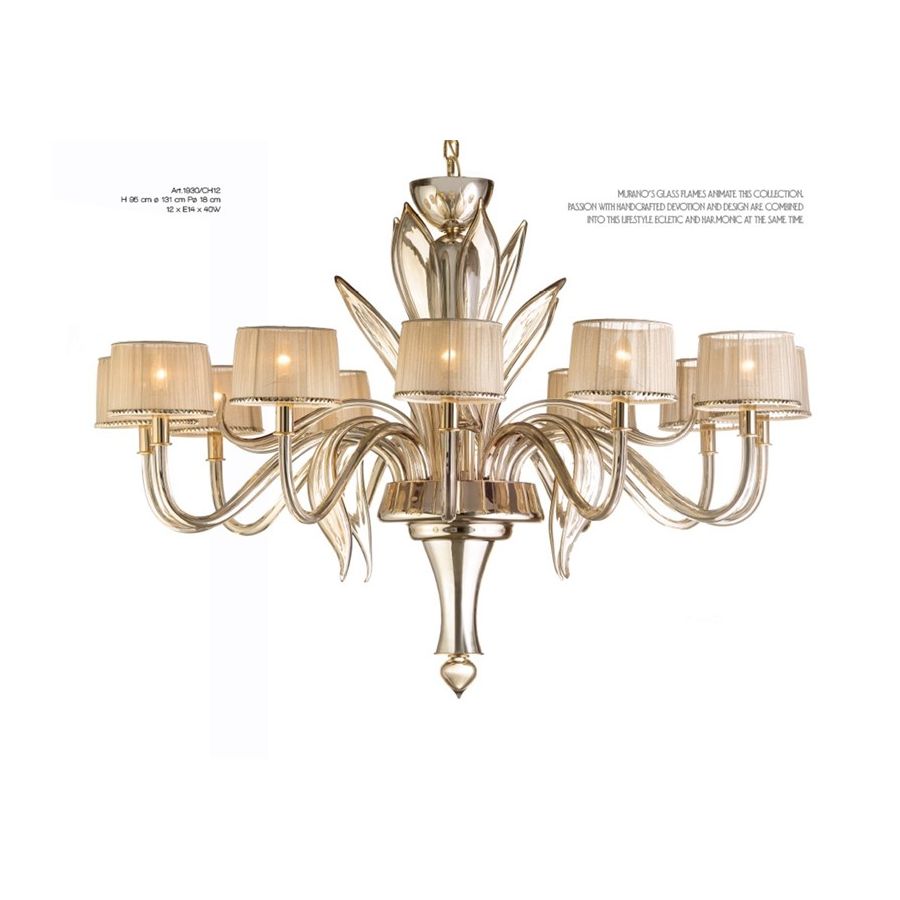 12 lights Chandelier in "Honey" Murano glass+mirror effect. Lighting item that diffuses the light with great effect in the surrounding environement creating a warm and welcoming atmosphere.