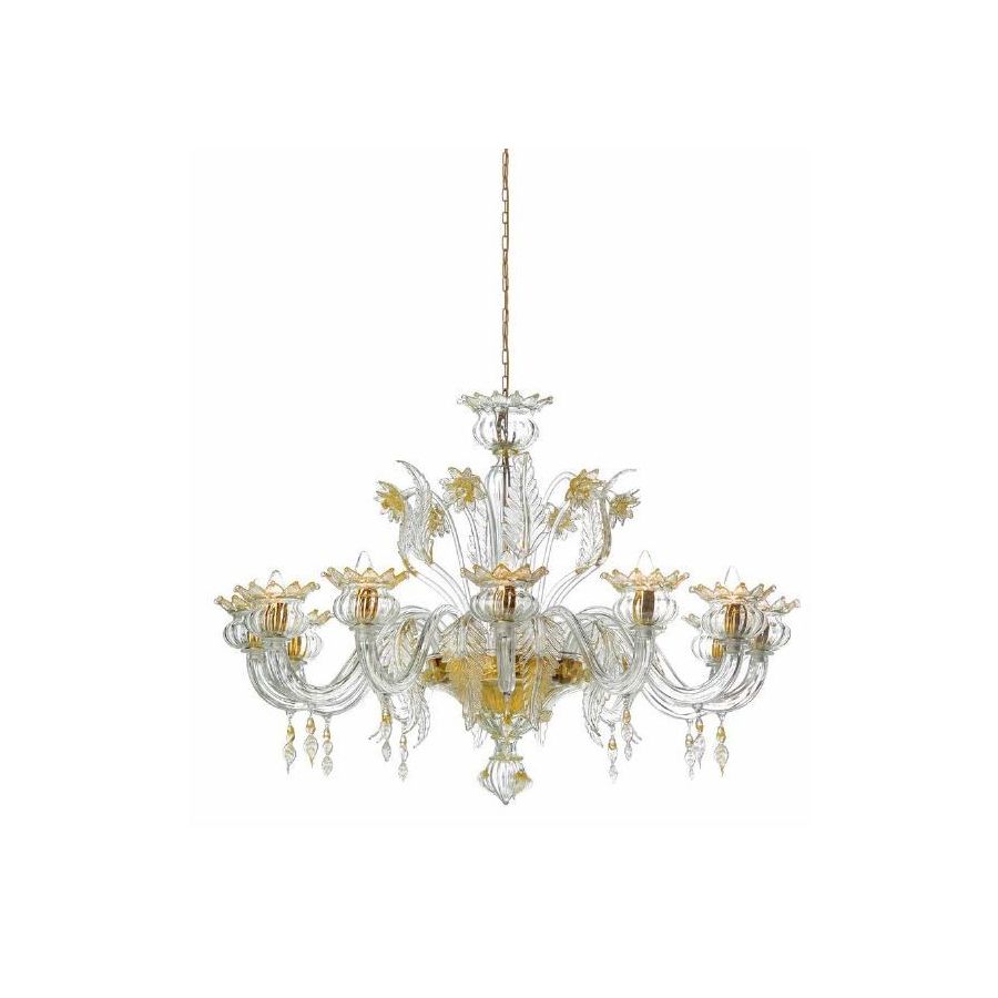 Murano Glass transparent chandelier with decorations in transparent + gold powder. Lighting item that diffuses the light with great effect in the surrounding environement creating a warm and welcoming atmosphere.