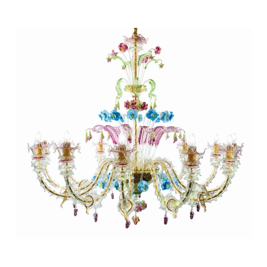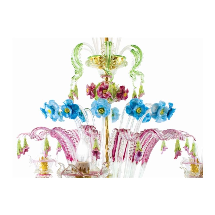 Murano Glass chandelier clear with colorful multicolor decorations. Lighting item that diffuses the light with great effect in the surrounding environement creating a warm and welcoming atmosphere.
