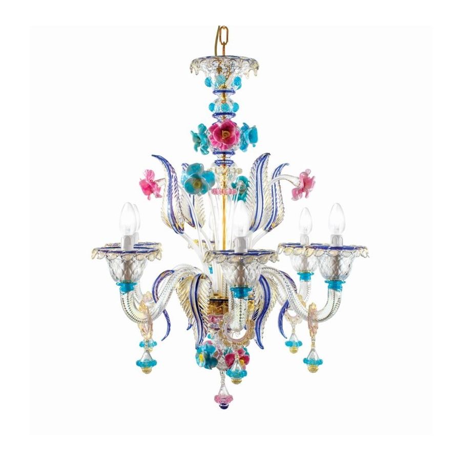 Murano Glass chandelier clear with colorful multicolor decorations. Lighting item that diffuses the light with great effect in the surrounding environement creating a warm and welcoming atmosphere.