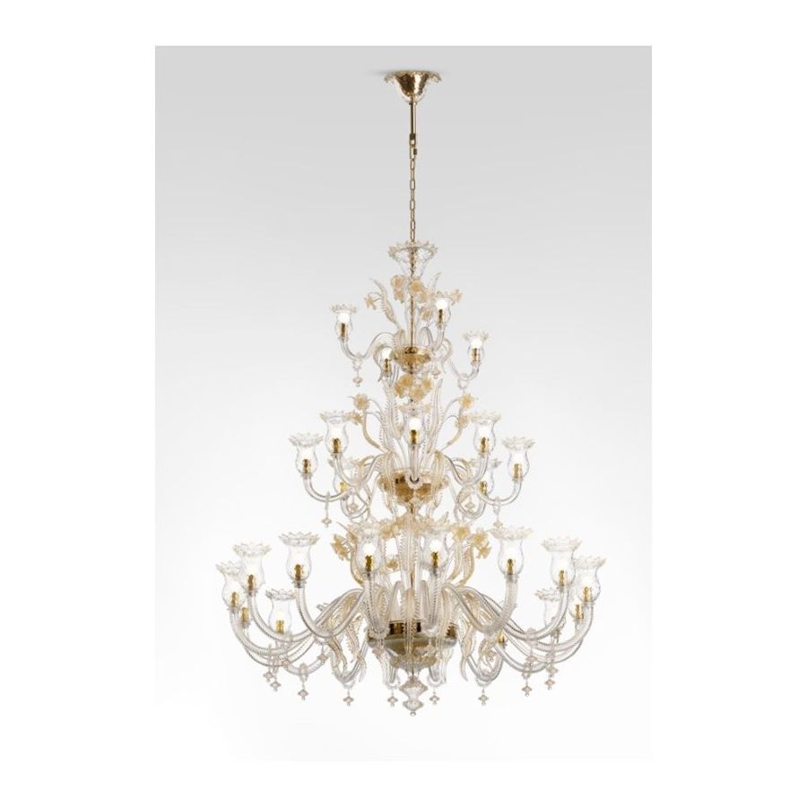 28 lights 3 tier Murano Glass chandelier clear with gold decorations. Lighting item that diffuses the light with great effect in the surrounding environement creating a warm and welcoming atmosphere.