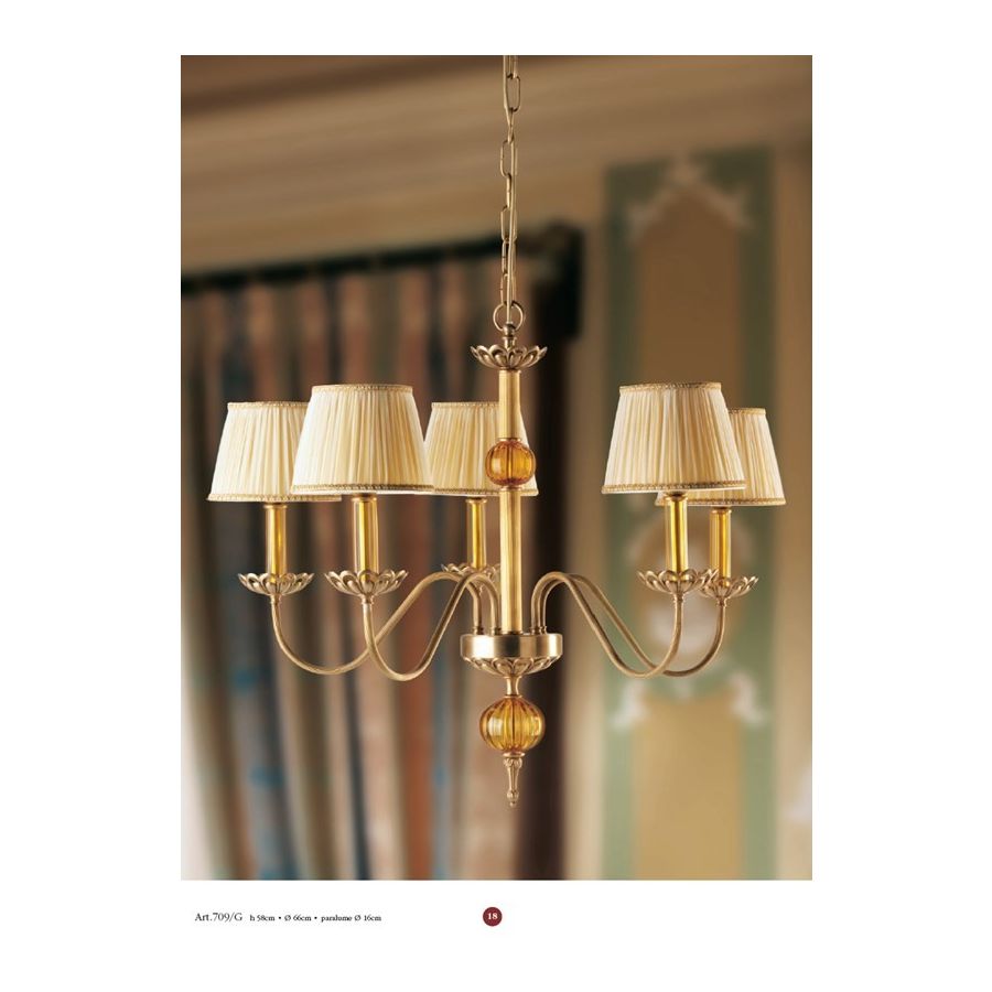 Chandelier 5 lights in brass with inserts of amber Murano glass and fabric lampshades. Lighting item that diffuses the light with great effect in the surrounding environement creating a warm and welcoming atmosphere.