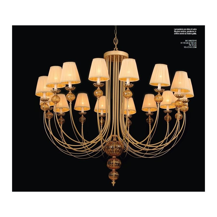 Chandelier 16 lights in brass with inserts of amber Murano glass and fabric lampshades. Lighting item that diffuses the light with great effect in the surrounding environement creating a warm and welcoming atmosphere.