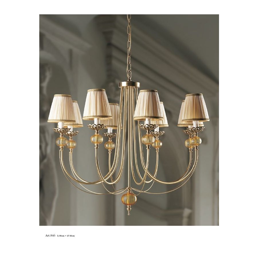 Chandelier 8 lights in brass with inserts of amber Murano glass and fabric lampshades. Lighting item that diffuses the light with great effect in the surrounding environement creating a warm and welcoming atmosphere.