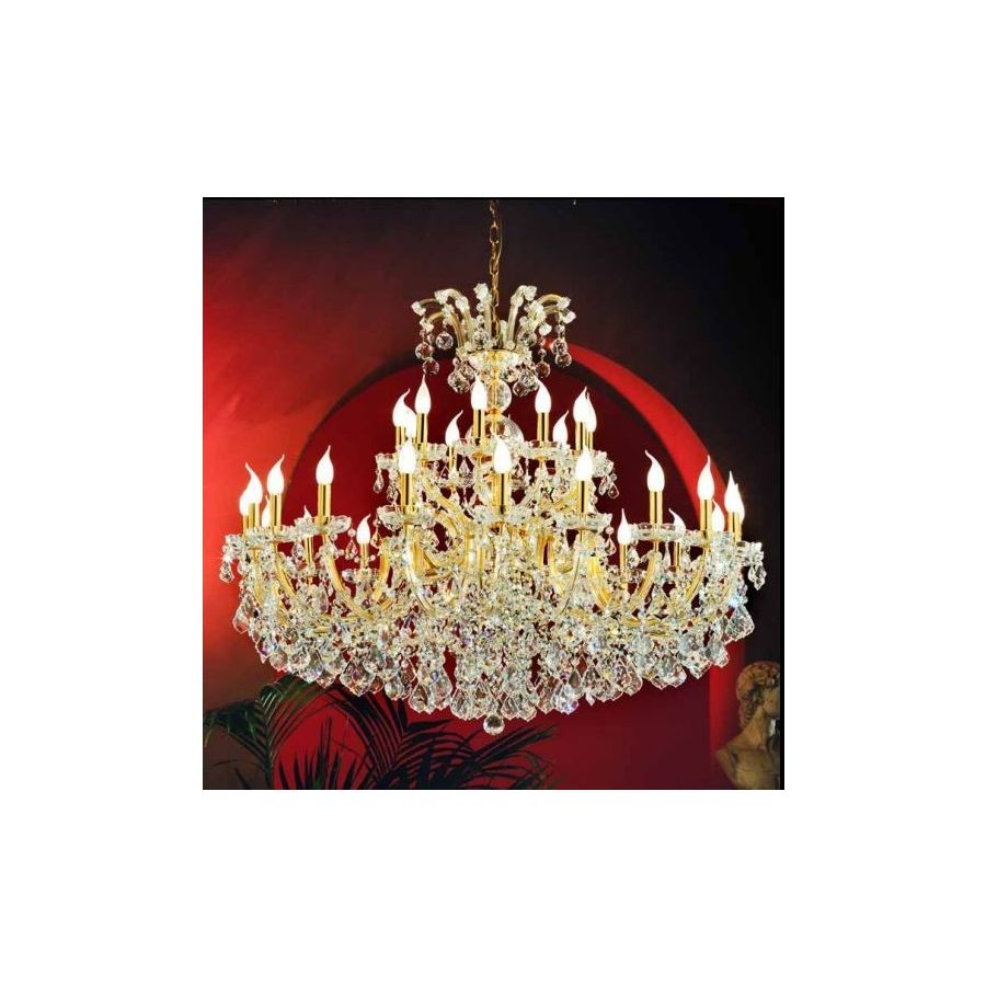 Mariateresa chandelier with Gold plated metal frame covered by transparent glass arms. The decorative elements and pendants are clear Asfour®. Lighting item that diffuses the light with great effect in the surrounding environement creating a warm and welcoming atmosphere.