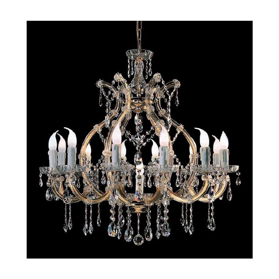 Mariateresa chandelier with Gold plated metal frame covered by transparent glass arms and transparent Crystal pendants. Lighting item that diffuses the light with great effect in the surrounding environement creating a warm and welcoming atmosphere.