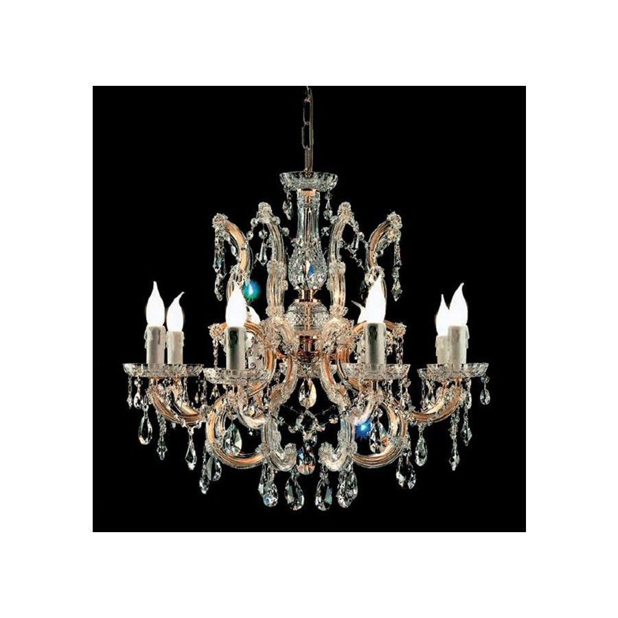 Mariateresa chandelier with Gold plated metal frame covered by transparent glass arms and transparent Crystal pendants. Lighting item that diffuses the light with great effect in the surrounding environement creating a warm and welcoming atmosphere.