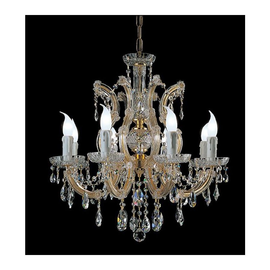 Mariateresa chandelier with Gold plated metal frame covered by transparent glass arms and transparent Crystal pendants. Lighting item that diffuses the light with great effect in the surrounding environement creating a warm and welcoming atmosphere.