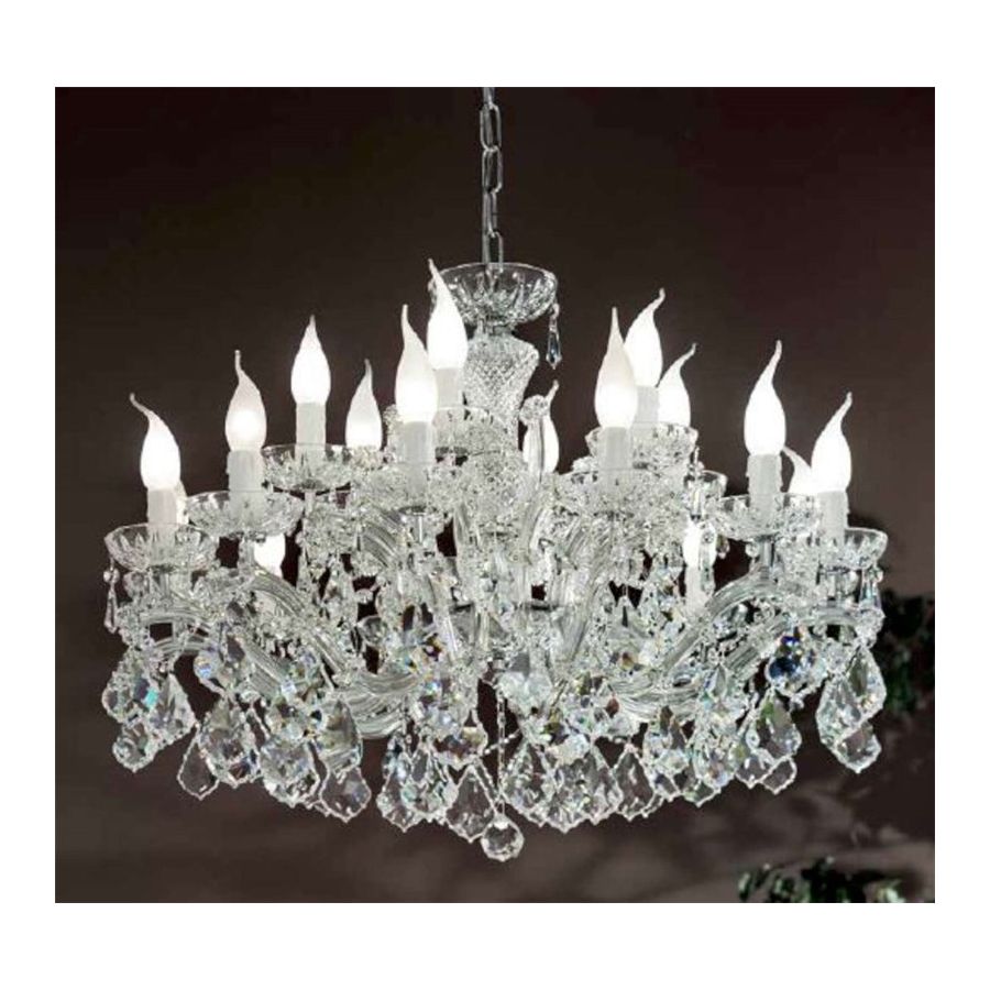Mariateresa chandelier with metal frame covered by transparent glass arms and transparent Crystal pendants. Lighting item that diffuses the light with great effect in the surrounding environement creating a warm and welcoming atmosphere.
