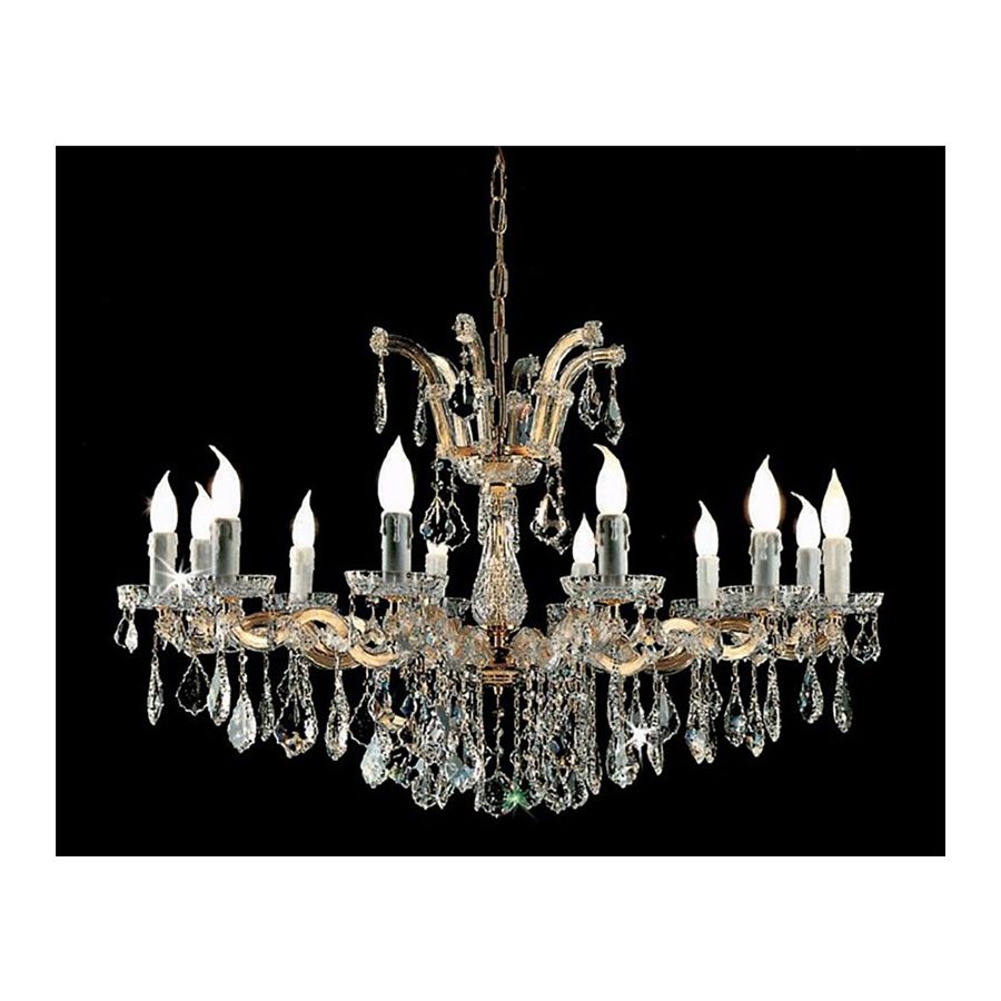 Mariateresa chandelier with Gold plated metal frame covered by transparent glass arms and transparent Crystal pendants. Lighting item that diffuses the light with great effect in the surrounding environement creating a warm and welcoming atmosphere.