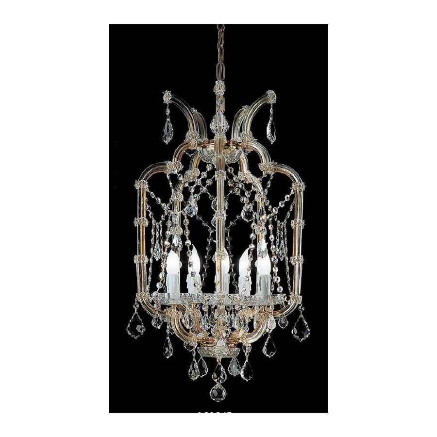Mariateresa chandelier with Gold plated metal frame covered by transparent glass arms and transparent Crystal pendants. Lighting item that diffuses the light with great effect in the surrounding environement creating a warm and welcoming atmosphere.