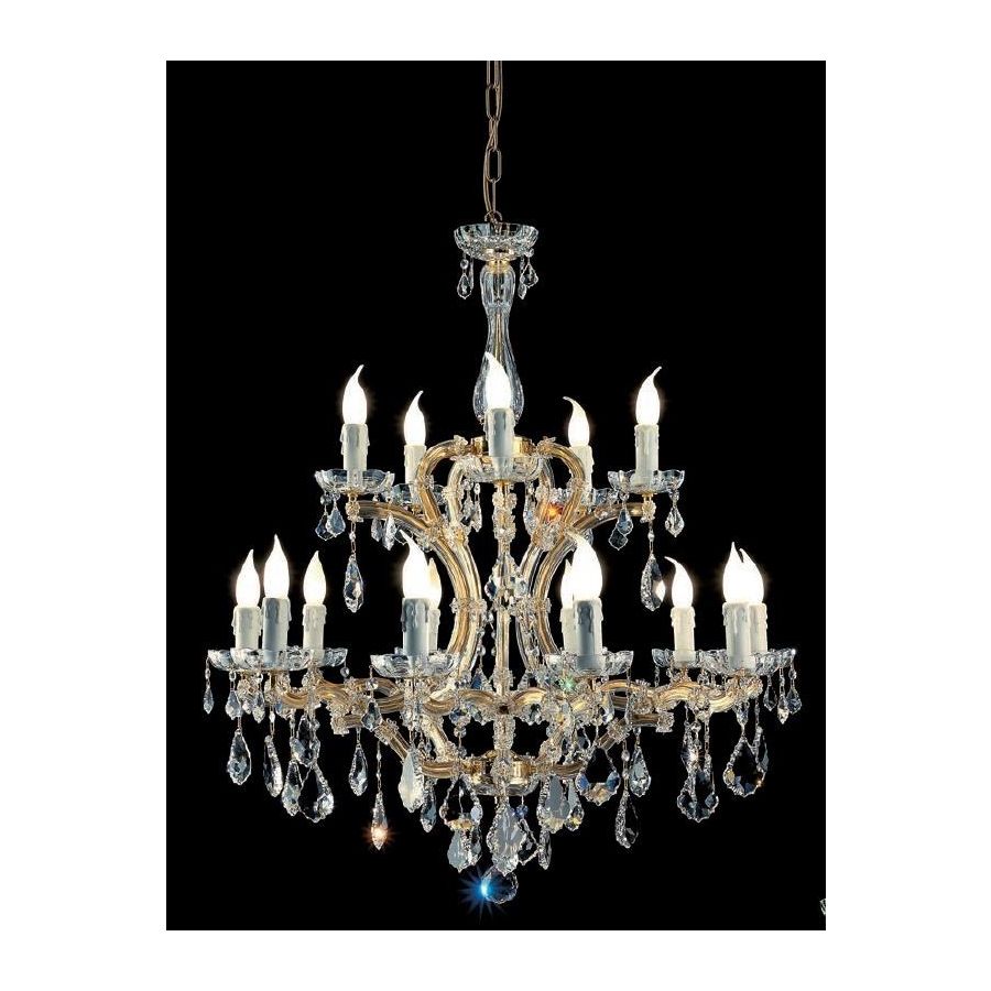 Mariateresa chandelier with Gold plated metal frame covered by transparent glass arms and transparent Crystal pendants. Lighting item that diffuses the light with great effect in the surrounding environement creating a warm and welcoming atmosphere.