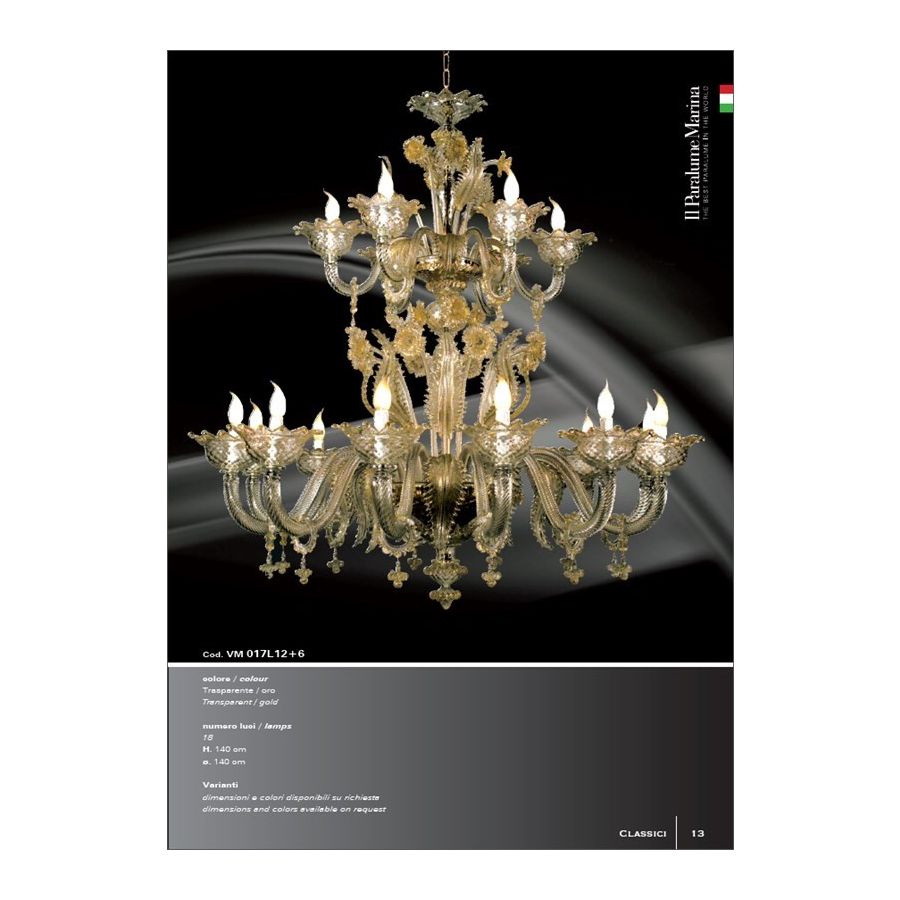 18 lights transparent and golden chandelier. Lighting fixture that diffuses the light into the surrounding environment with great effect, creating a warm and welcoming atmosphere.