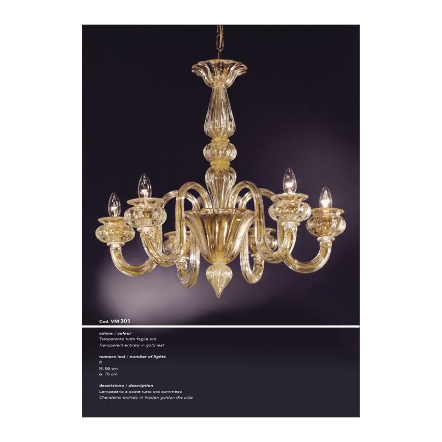 Sommerso gold ribbed chandelier, 6 lights. Lighting fixture that diffuses the light into the surrounding environment with great effect, creating a warm and welcoming atmosphere.